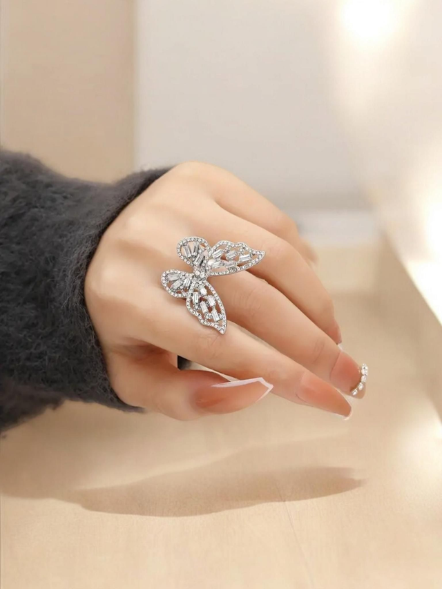 Affichez votre charme irrésistible avec cette magnifique bague papillon en alliage de zinc plaqué-argent. Incrustée de strass et de zircons cubiques scintillants, cette bague est l'accessoire parfait pour ajouter une touche de glamour à votre tenue.