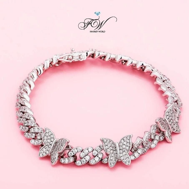 Bracelet maille cubaine et papillons en diamants pour femmes: stylé et classe avec une finition de qualité, ce bracelet en cuivre de synthèse plaqué-or blanc 18 carats véritable est pavé de diamants ( Zircon AAA +) simulés en laboratoire . Il a un épaisseur de 9mm et mesure 17cm ou 20cm(sur demande). Délai de livraison de 7 à 10 jours ouvrés.