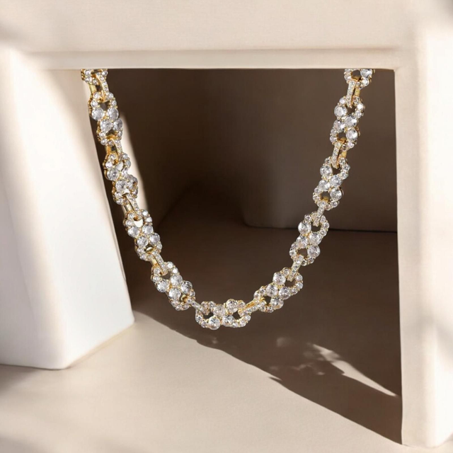 Élégant et tendance, ce collier à maillons en cuivre plaqué or 18 carats, orné de zircones cubiques scintillantes, est parfait pour sublimer vos tenues de soirée. Inspiré de la culture hip-hop, il est idéal pour les événements festifs et les occasions spéciales.