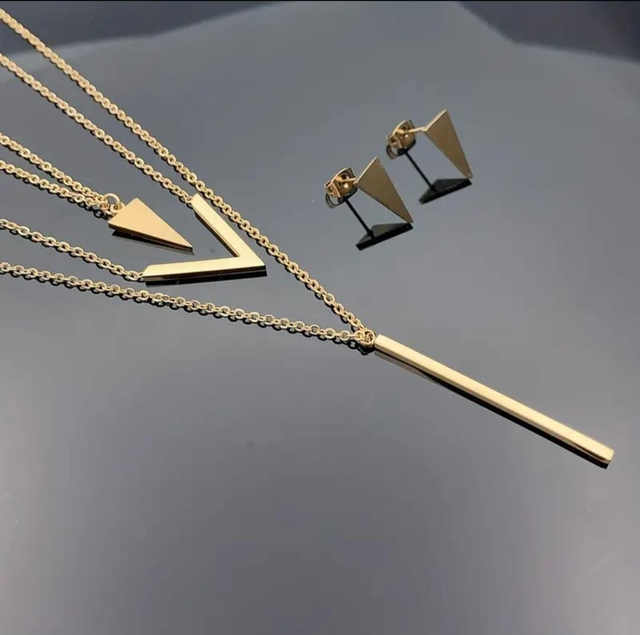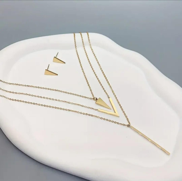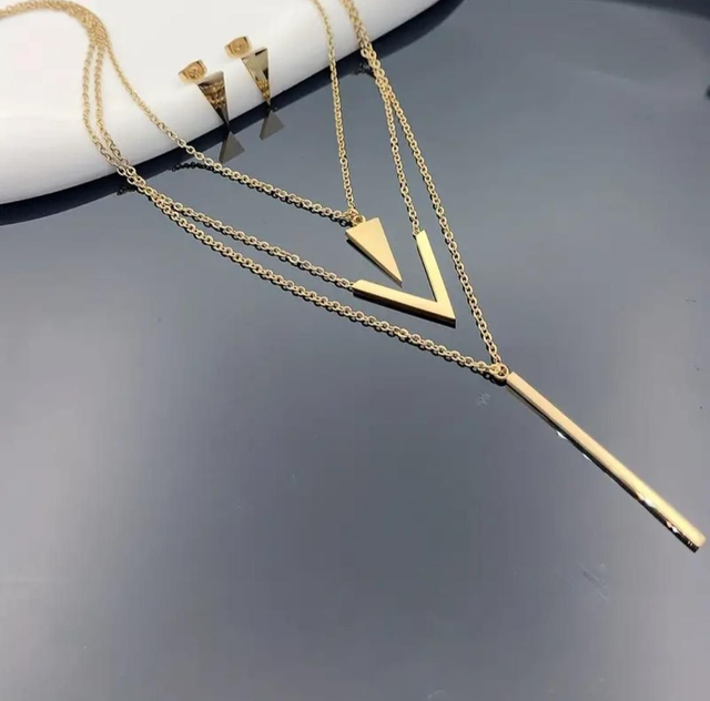 Offrez ou achetez-vous cette magnifique parure de bijoux composée d'un collier à rangs multiples avec pendentifs géométriques en Acier Inoxydable plaqué-or 18k et d'une paire de boucles d’oreilles Triangulaire. Les pendentifs sont respectivement en forme triangulaire, en forme de V et enfin en forme de bande. Cette parure mettra assurément votre décolleté ou col roulé en valeur. En la faisant vôtre, vous serez plus que jamais belle, sexy et attirante. À porter aussi bien au quotidien que pour une occasion particulière.