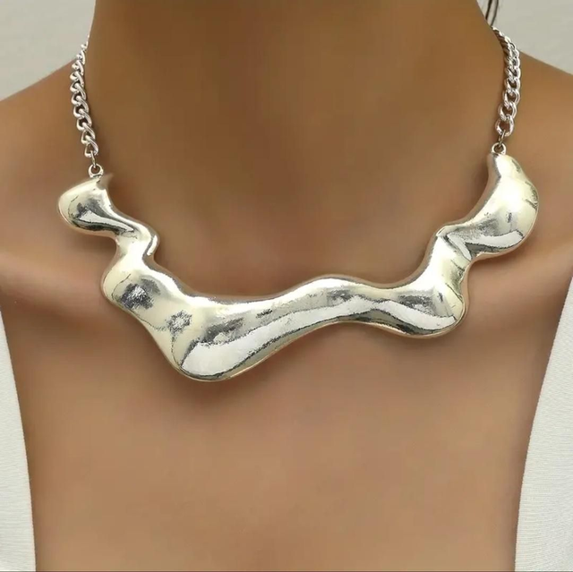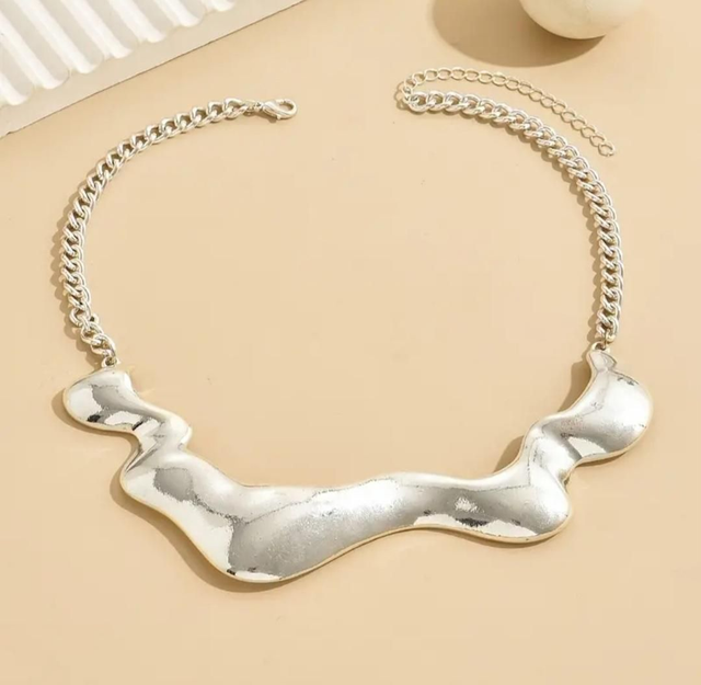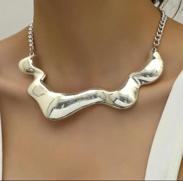 En alliage de zinc plaqué platine, ce bijou unique allie sophistication et originalité grâce à ses courbes fluides et sa finition brillante. Parfait pour ajouter une touche artistique à n'importe quelle tenue, ce collier est un véritable accroche-regard.