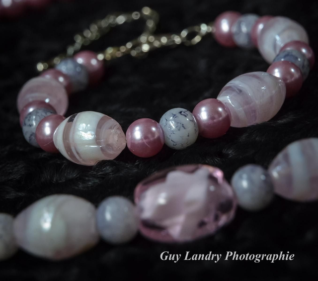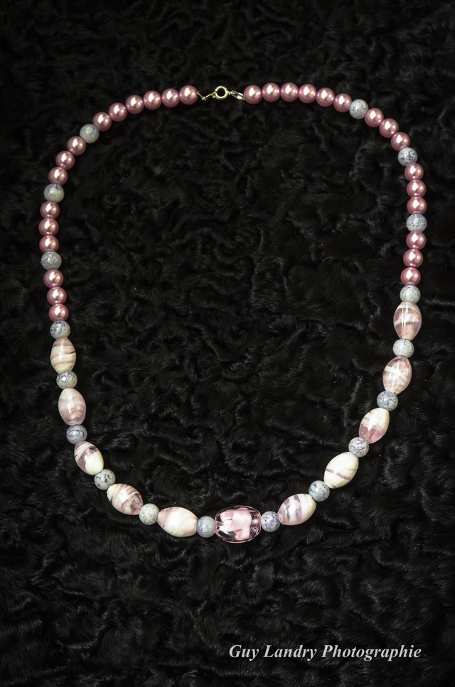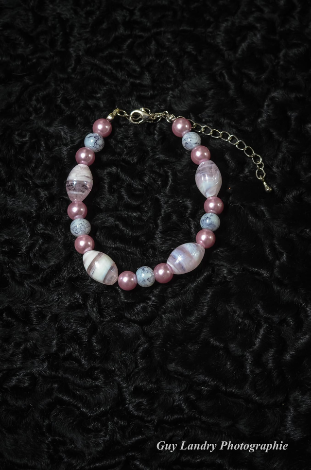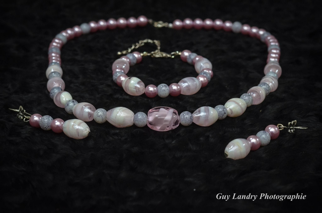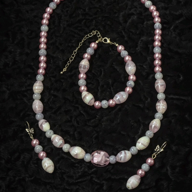 Parure de bijoux faite main composée d'un collier, bracelet et paire de boucles d'oreilles en perles de verre, verre vénitien et métal argenté sans nickel.