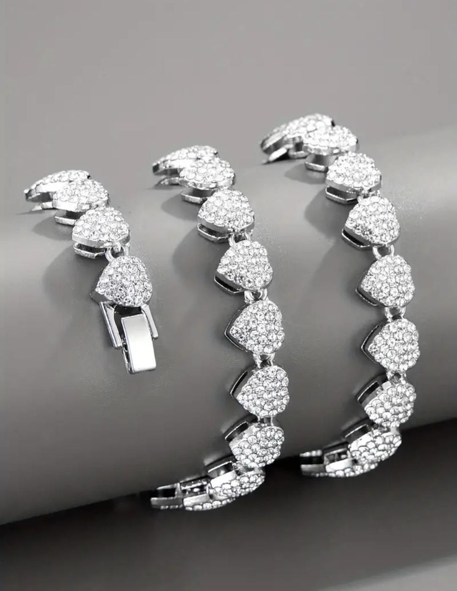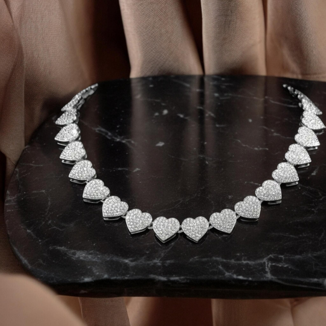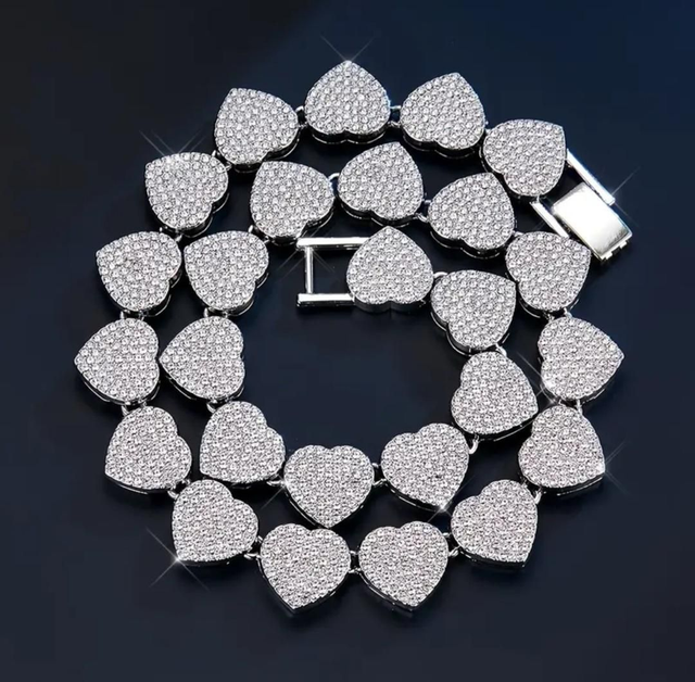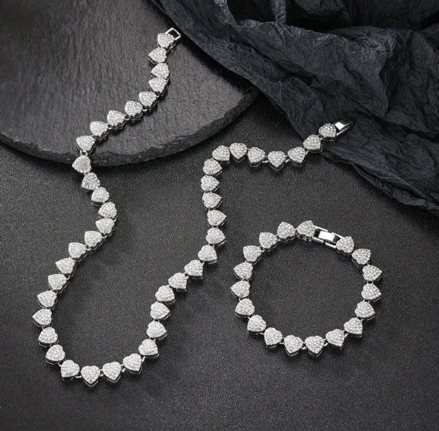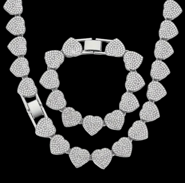 Mettez en valeur votre style avec notre magnifique parure de bijoux constituée d'un collier et bracelet en maillons cubains en forme de cœur, entièrement pavés de strass scintillants.
