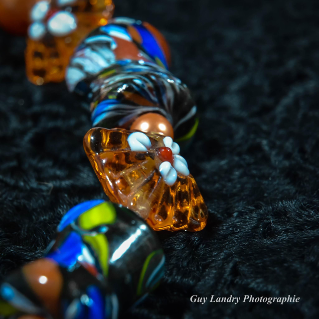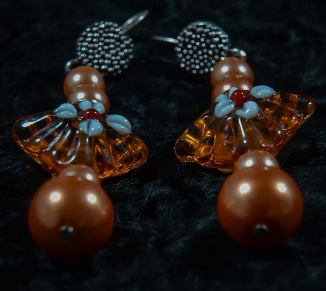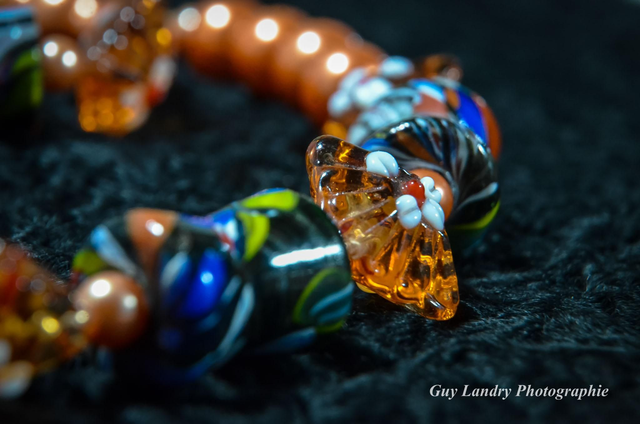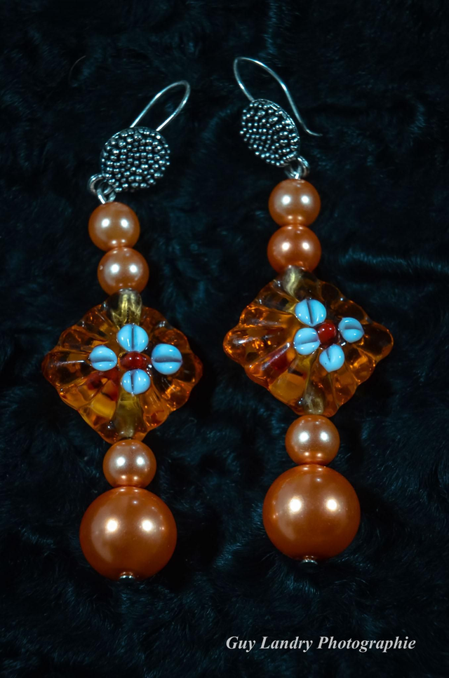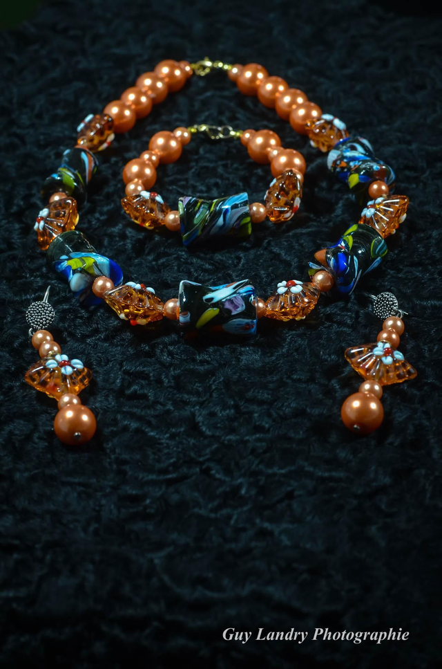 Parure de bijoux composée d'un collier, bracelet, paire de boucles d’oreilles en perles de verre soufflé à la bougie et peintes à la main, en perles millefuori en porcelaine, perles de verre orange et en alliage de métal argent hypoallergénique . Chaque perle créée main est différente l'une de l'autre. Pièce unique. Bijoux de créateur.