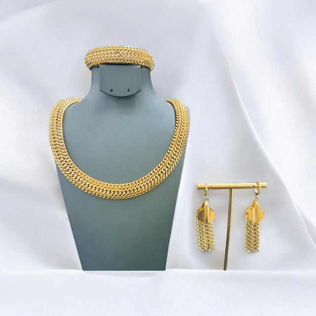 Ajoutez une touche de glamour à votre collection de bijoux avec cette parure en cuivre plaqué-or 24k. Comprenant un collier élégant un bracelet et des boucles d'oreilles assortis, ce set est conçu pour les femmes qui apprécient la sophistication et l'élégance.