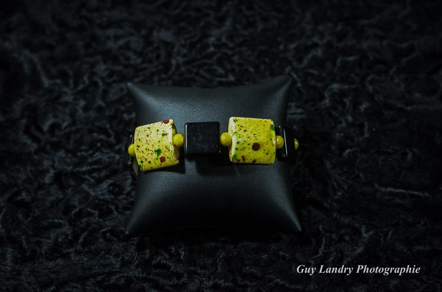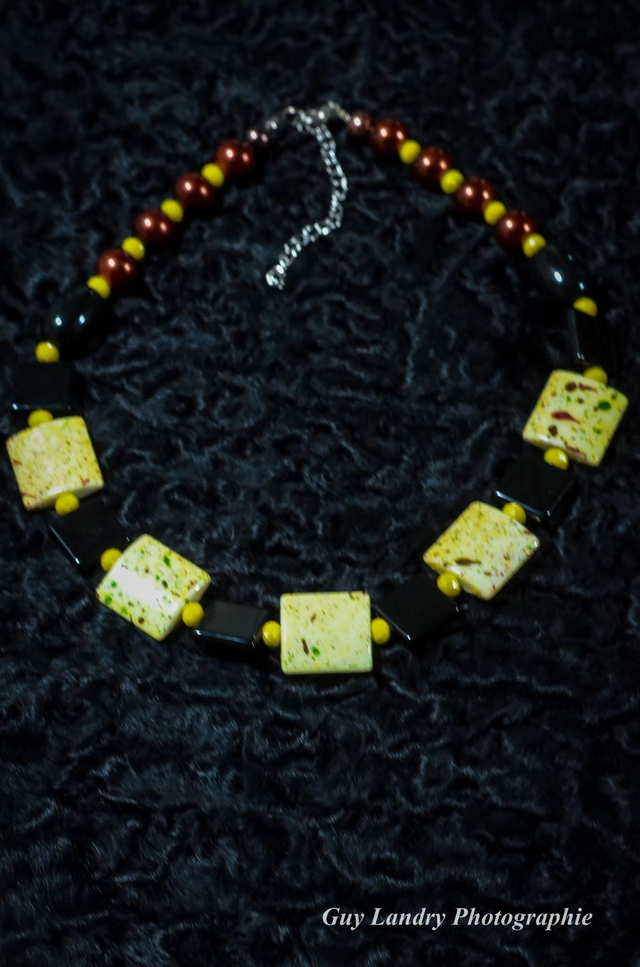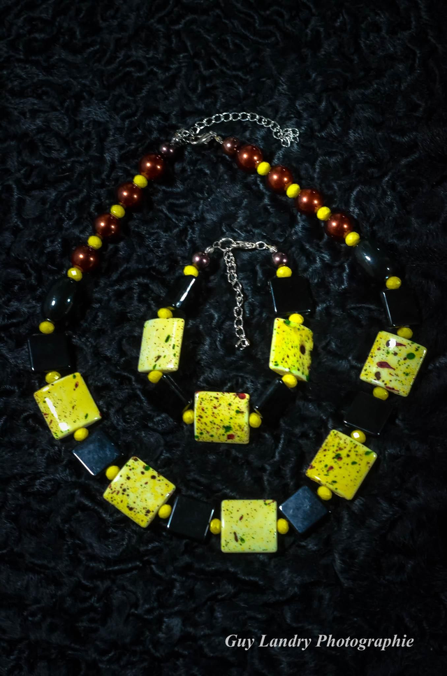 Très belle parure de bijoux faite à la main en céramique et perles de verre. Fermoirs en métal argenté sans nickel. Pièce unique.