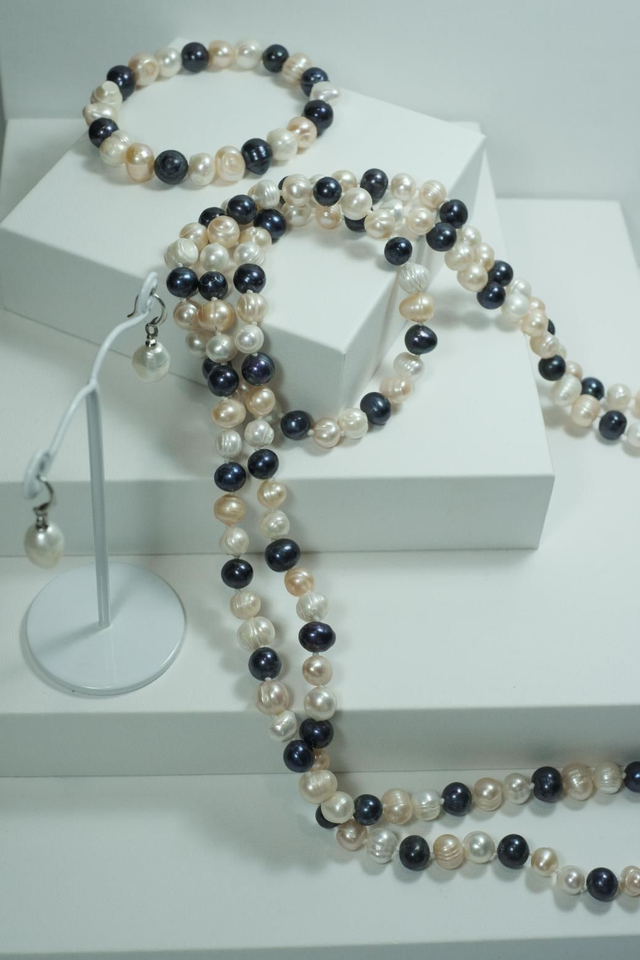 Superbe parure de bijoux faite à la main en véritable perles de culture d’eau douce composée d’un collier sautoir, d’un bracelet et d’une paire de boucles d'oreilles. Très élégante et intemporelle, elle s’assortira sans difficulté avec votre entière garde robe . La longueur de son collier vous permet de le porter en sautoir long ou en collier à rang multiple selon votre envie du jour et votre tenue, quelque soit la saison.