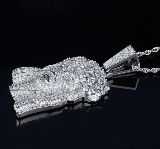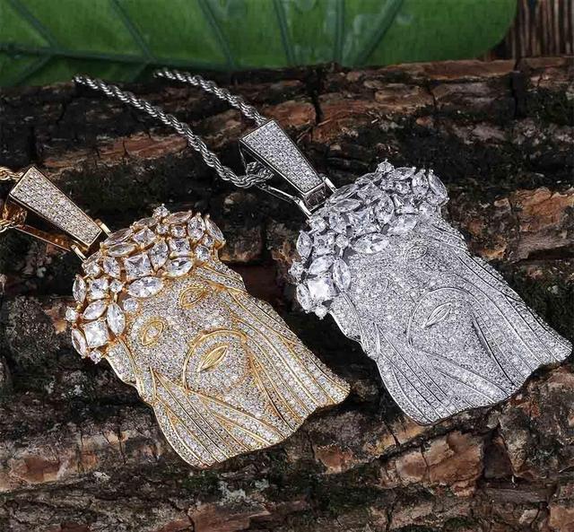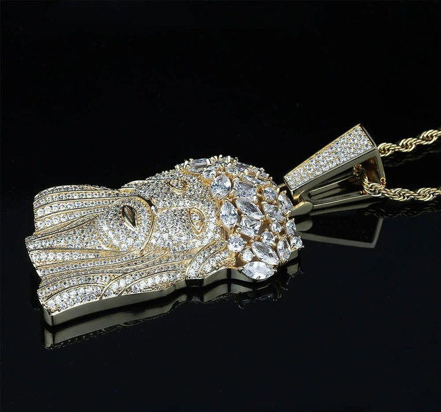 Ce magnifique collier plaqué-or 18K avec son pendentif représentant la tête de Jésus-Christ incrusté de véritables diamants, simulés en laboratoire, pourra être offert pour un baptême, une fête d'anniversaire ou en cadeau de noël.